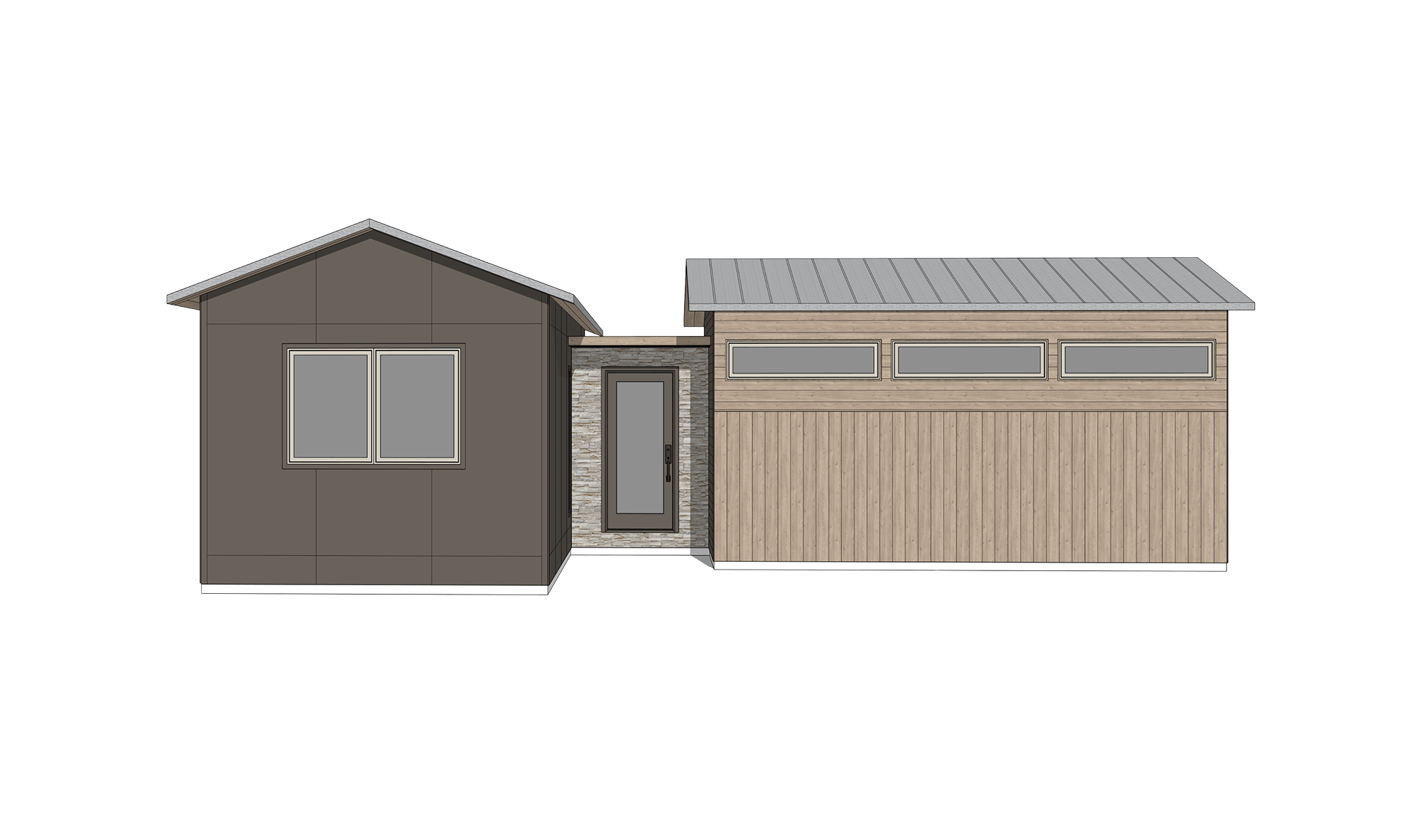 Apex metal roof, 29 gauge. Gable roofline with flat roof on entry module.